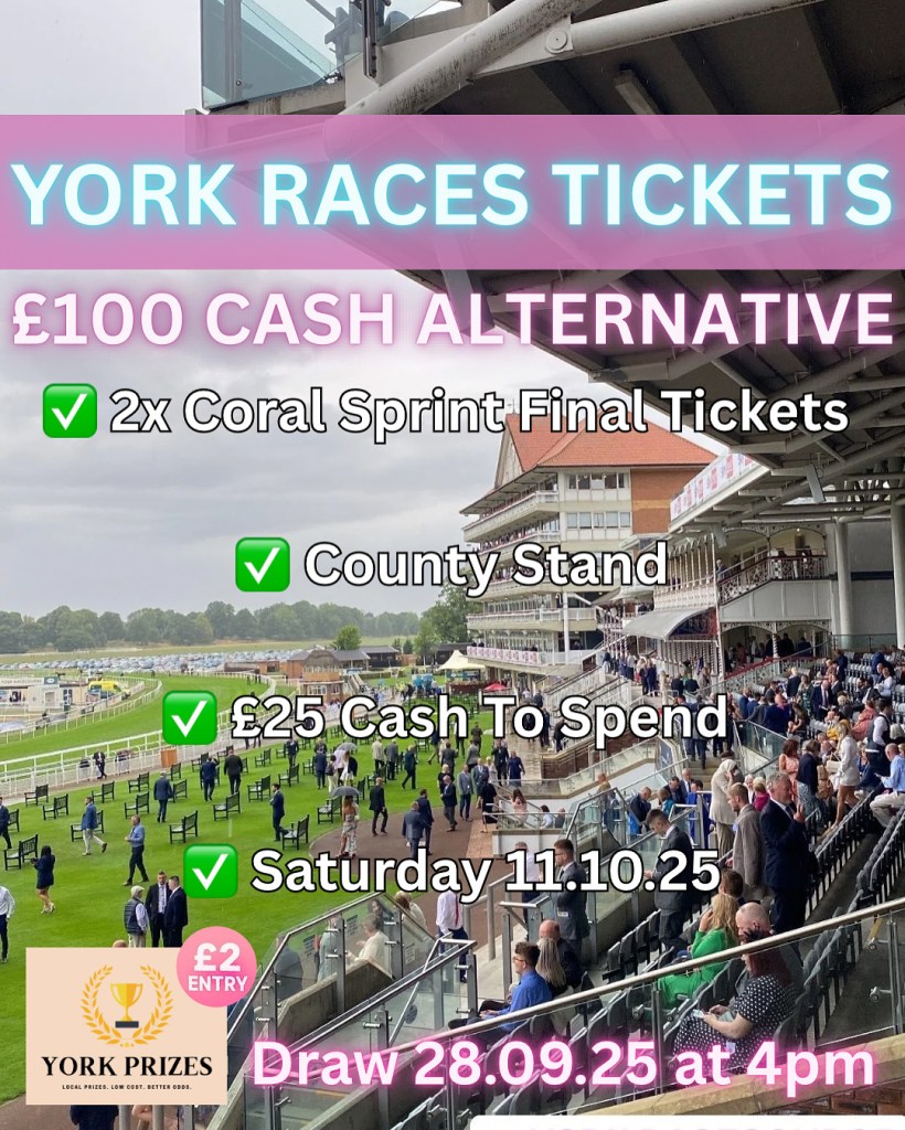 As per our August £100 Cash Prize Draw, we are going to be doing a recorded video at the stated time (4pm 28.09.25) using a ‘Spin the Wheel’ random generator, this will be posted to our instagram account @YorkPrizes. As proven it could only take SIX tickets to win, so get yours today!